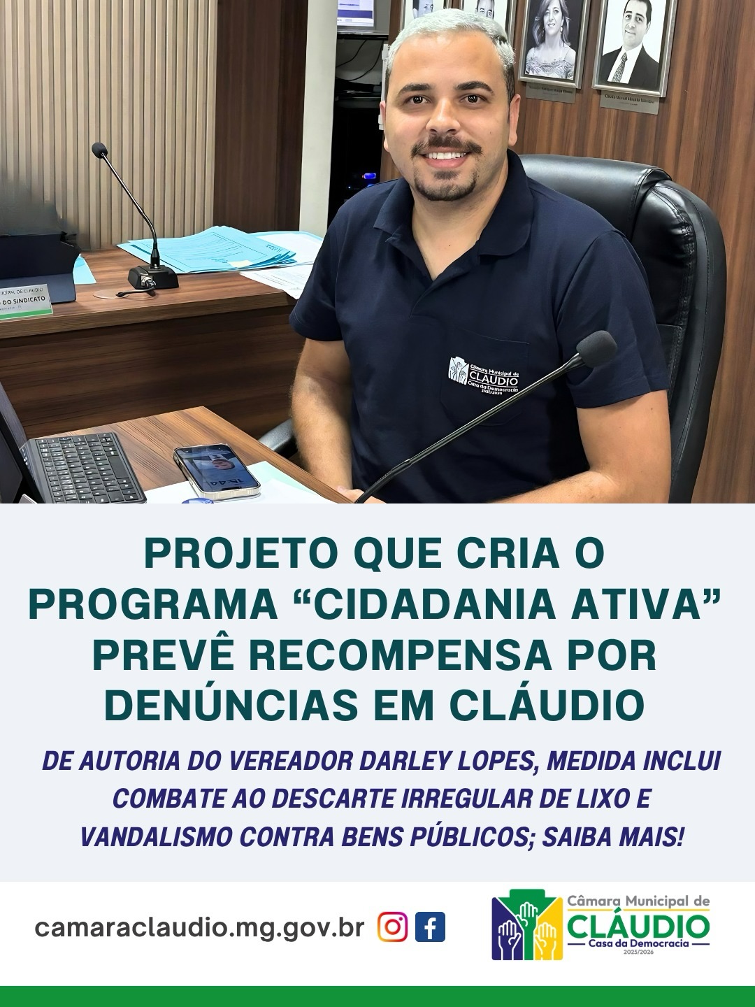 Projeto que cria o programa "Cidadania Ativa" prevê recompensa por denúncias em Cláudio
