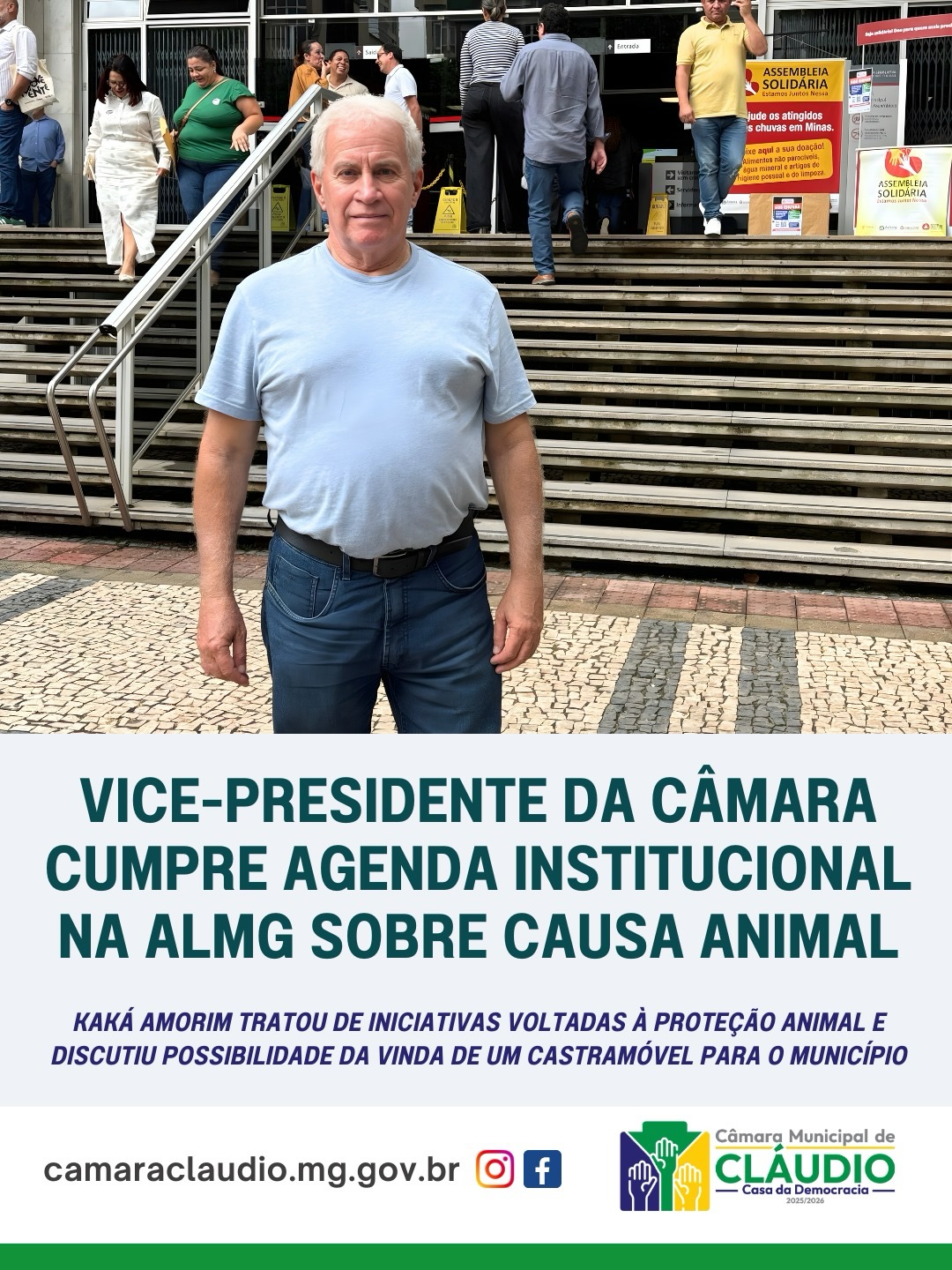 O vice-presidente da Câmara Municipal de Cláudio, Kaká Amorim, cumpriu agenda institucional em Assembleia Legislativa de Minas Gerais, em Belo Horizonte, onde tratou de pautas relacionadas à causa animal.