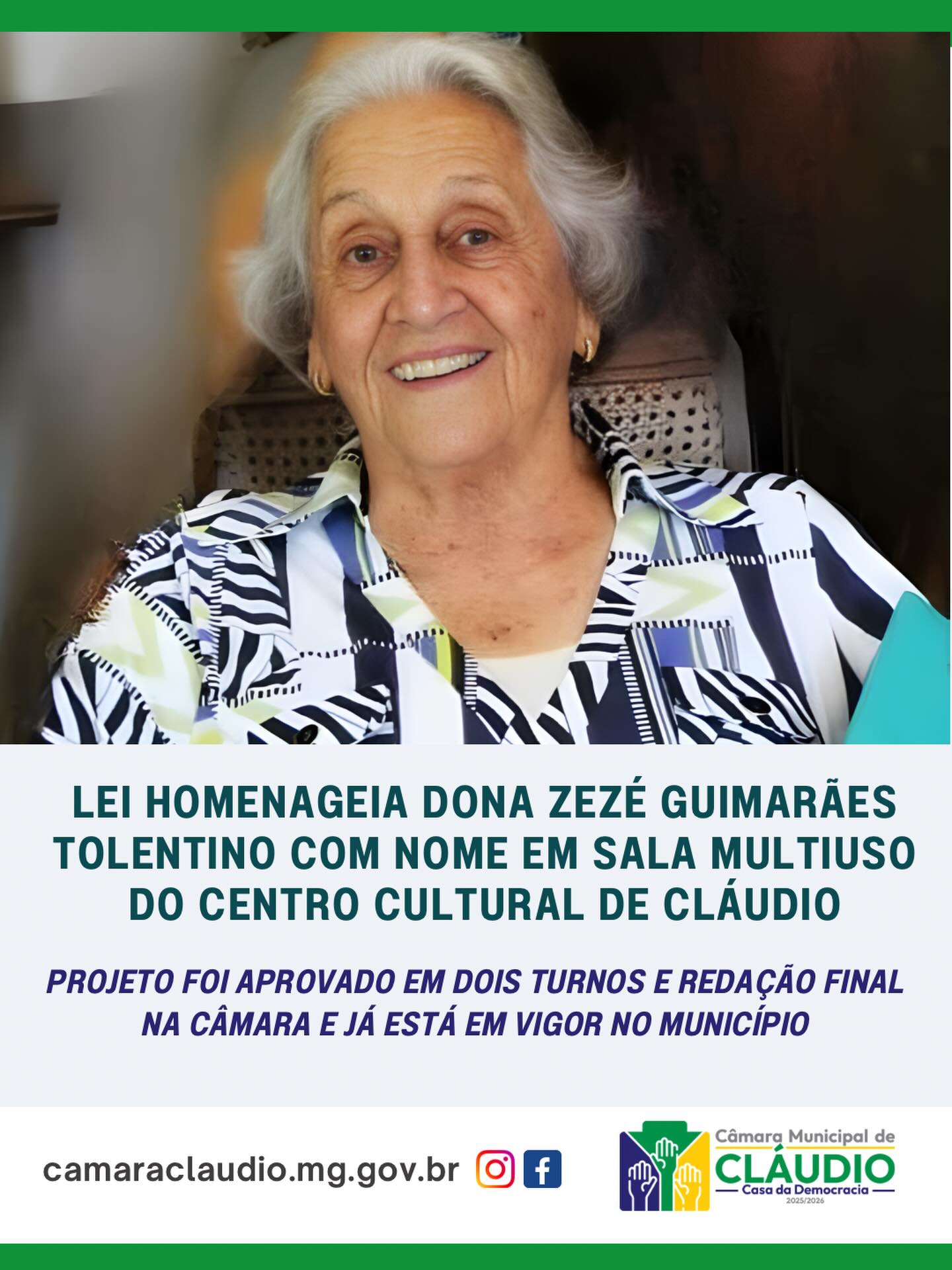 A Câmara Municipal de Cláudio aprovou, em dois turnos e redação final, o Projeto de Lei nº 14/2026, que denomina como “Sala Maria José Guimarães Tolentino – Dona Zezé” a sala multiuso localizada no Centro Cultural Cláudio Nogueira Azevedo. A proposta já foi sancionada e transformada na lei municipal 1930/2026, em vigência desde segunda-feira, dia 13.