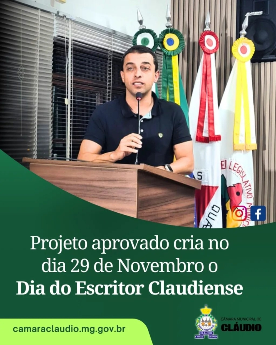 A Câmara Municipal de Cláudio aprovou esta semana projeto de lei que cria o Dia do Escritor Claudiense. A matéria legislativa é de autoria do vereador Fernando Tolentino (PSDB) e foi aprovada em dois turnos e redação final antes de seguir para ser sancionada.