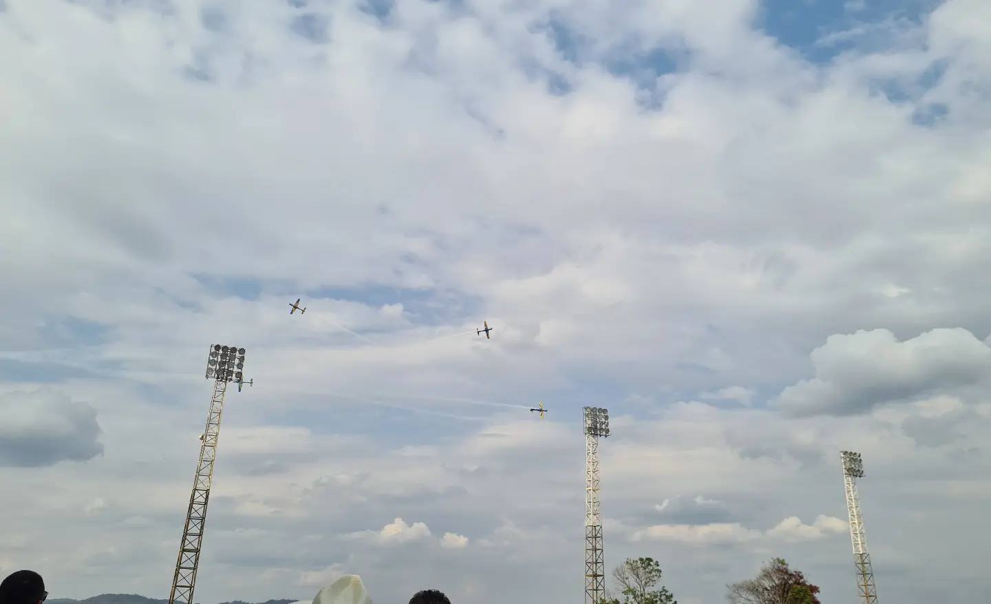 Um total de sete aeronaves da Força Aérea Brasileira (FAB) realizaram, durante quase uma hora, manobras e uma exibição que lotou o estádio do carmense de crianças, pais, moradores e autoridades da região.