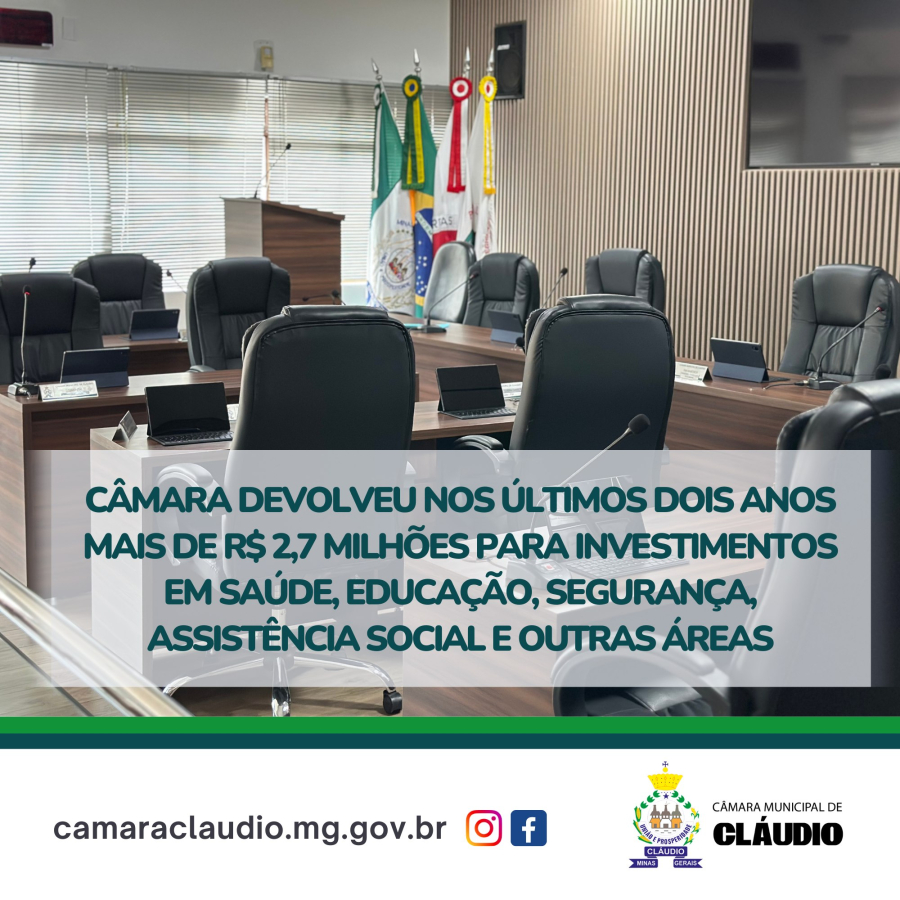A Mesa Diretora da Câmara Municipal de Cláudio, no biênio 2023/2024, realiza uma importante ação de transparência e responsabilidade fiscal com a devolução de mais de R$ 2,7 milhões para a Prefeitura.
