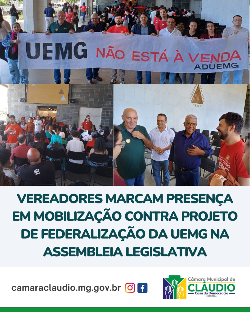 Os vereadores Evandro da Ambulância, Maurilo do Sindicato e Geraldo Lázaro dos Santos (Tindora) acompanharam nesta terça-feira (1°) a mobilização da comunidade acadêmica da Universidade do Estado de Minas Gerais (UEMG), em Belo Horizonte, contra o projeto de lei que prevê a federalização da instituição. O município de Cláudio conta com uma unidade da UEMG, que atende estudantes do município e da região em quatro cursos gratuitos.
