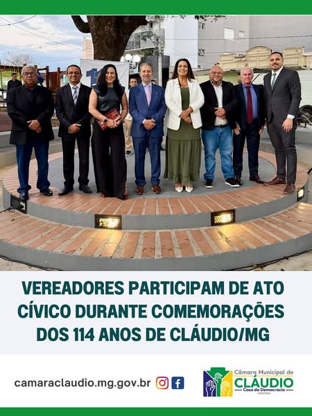 A Câmara Municipal de Cláudio, através de seis vereadores, participaram das celebrações dos 114 anos do município, ocorrido no sábado (30). As atividades incluíram uma Missa em Ação de Graças na Igreja Matriz do Centro, seguida de evento cívico no Jardim Monte Castelo com a Banda de Música e do grupo de Escoteiros Vinicio de Souza Mitre.