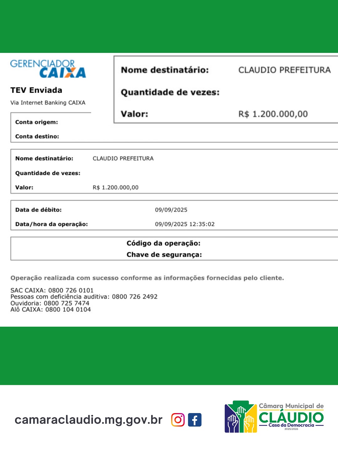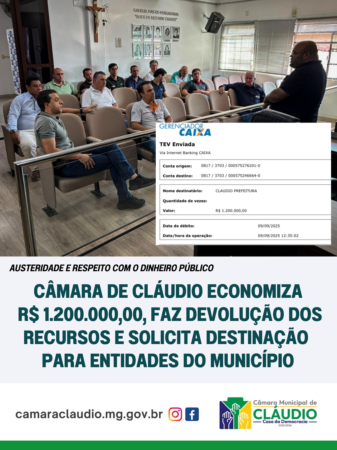 A Câmara Municipal de Cláudio oficializou, na manhã de terça-feira (9), a devolução de R$ 1.200.000,00 (Um milhão e duzentos mil reais) à Prefeitura Municipal, fruto da economia realizada ao longo do exercício de 2025. Nos últimos anos, este foi o maior montante destinado por meio de antecipação de duodécimo.
