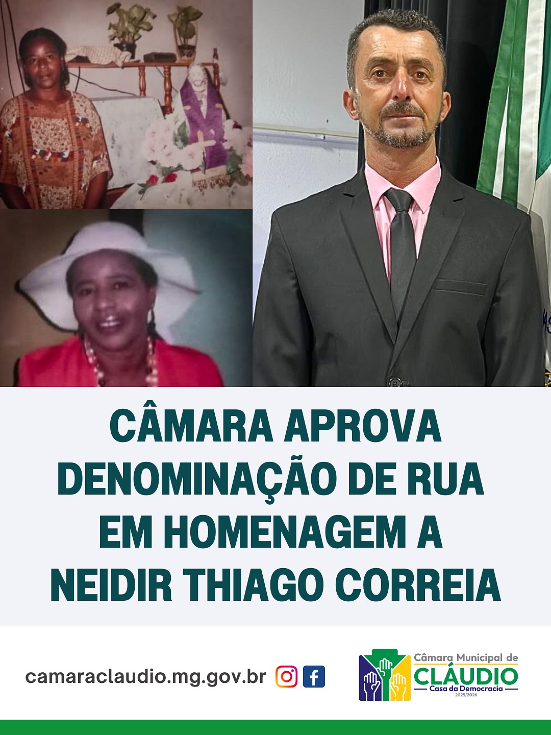 O plenário da Câmara Municipal de Cláudio também deliberou e aprovou esta semana o Projeto de Lei nº 32/2025, de autoria do vereador Nivaldo (PDT), que dá denominação à Rua de Cima, localizada no povoado de Matias, na zona rural do município. O logradouro passará a se chamar “Rua Neidir Thiago Correia”. A proposição segue agora para sanção do Executivo.