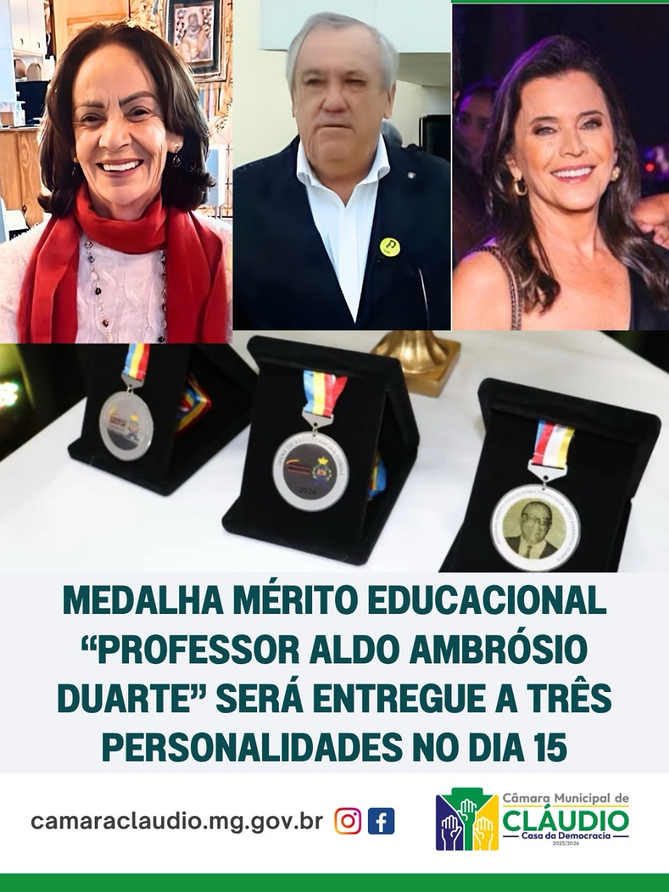 A Câmara Municipal de Cláudio aprovou esta semana o projeto de Decreto Legislativo que concede a Medalha “Mérito Educacional Professor Aldo Ambrósio Duarte” a três personalidades indicadas pelas instituições que integram a homenagem. O documento foi promulgado pela Mesa Diretora e se tornou o Decreto 8/2025.