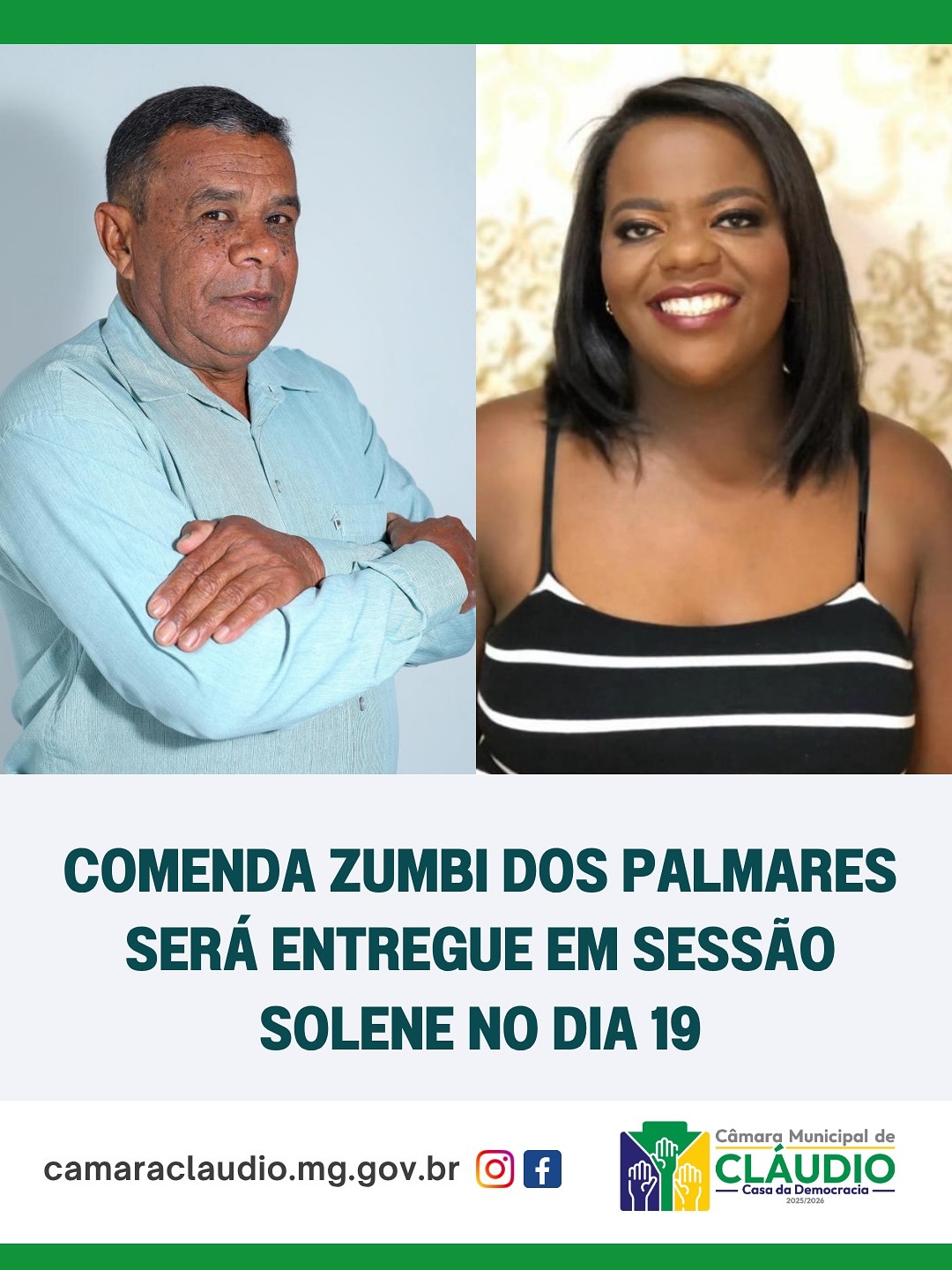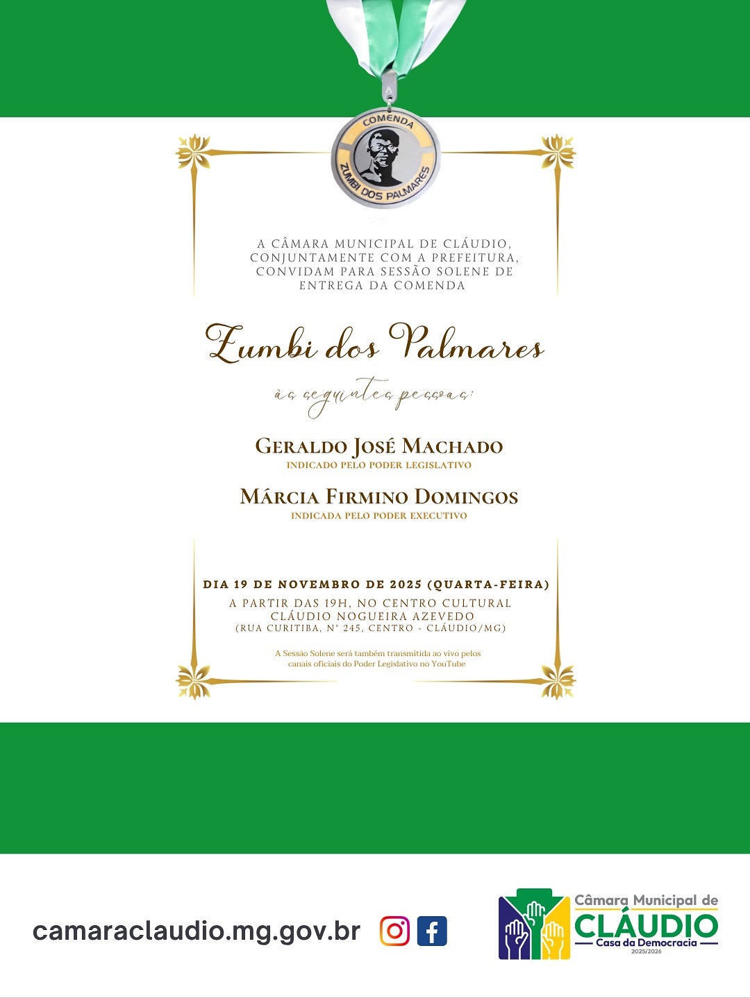 A Câmara Municipal de Cláudio, em parceria com a Prefeitura, realizará no dia 19 de novembro de 2025 (quarta-feira), a partir das 19h, a sessão solene de entrega da Comenda Zumbi dos Palmares. O evento ocorrerá no Centro Cultural Cláudio Nogueira Azevedo, localizado na Rua Curitiba, nº 245, Centro, e integra a programação municipal do mês da Consciência Negra.