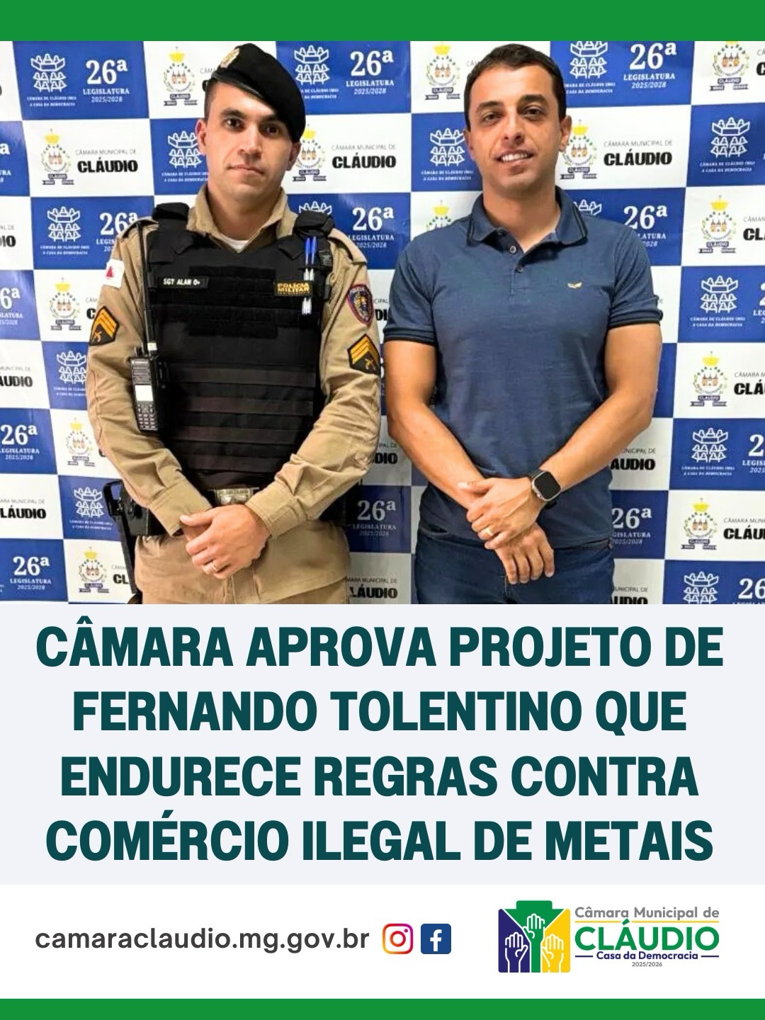 A Câmara Municipal de Cláudio aprovou, em dois turnos e redação final, na sessão plenária de segunda (24), o Projeto de Lei nº 43/2025, de autoria do vereador Fernando Tolentino (PSDB), que institui a Política Municipal de Prevenção e Combate ao Furto, Receptação e Comércio Ilegal de Materiais Metálicos, Veículos e Peças Usadas. A matéria agora segue para sanção do prefeito José Rodrigues Barroso de Araújo.
