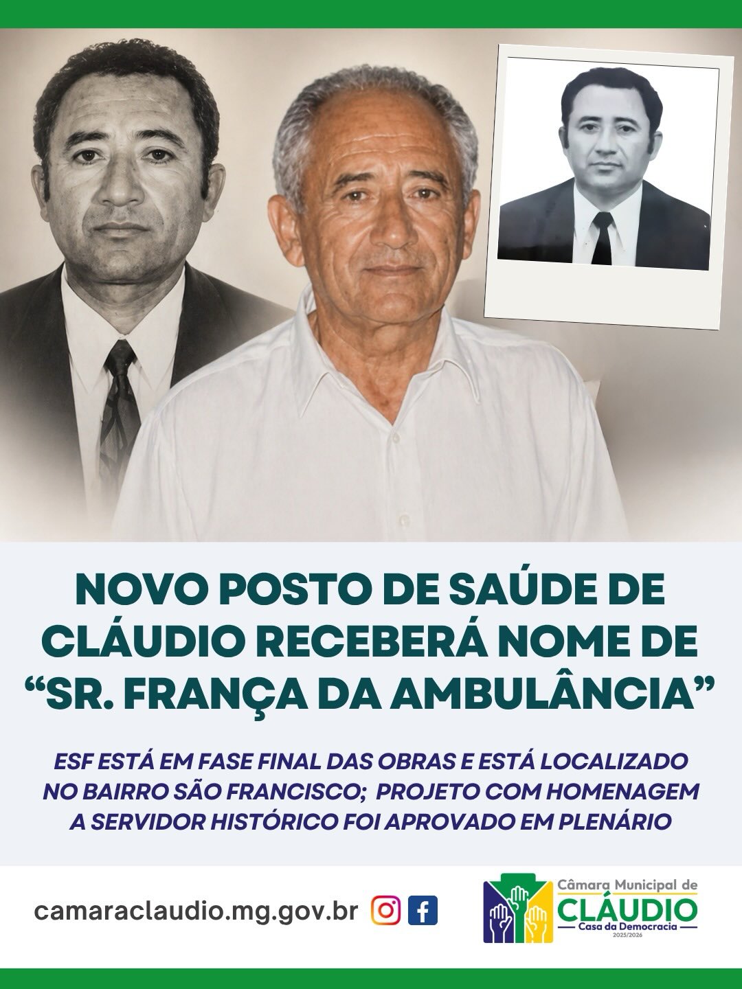 A Câmara Municipal de Cláudio também aprovou em plenário o Projeto de Lei nº 05/2026, de autoria do Poder Executivo, que denomina o novo estabelecimento de saúde da Estratégia Saúde da Família (ESF X), localizado no bairro São Francisco. A matéria foi encaminhada para sanção do Executivo.